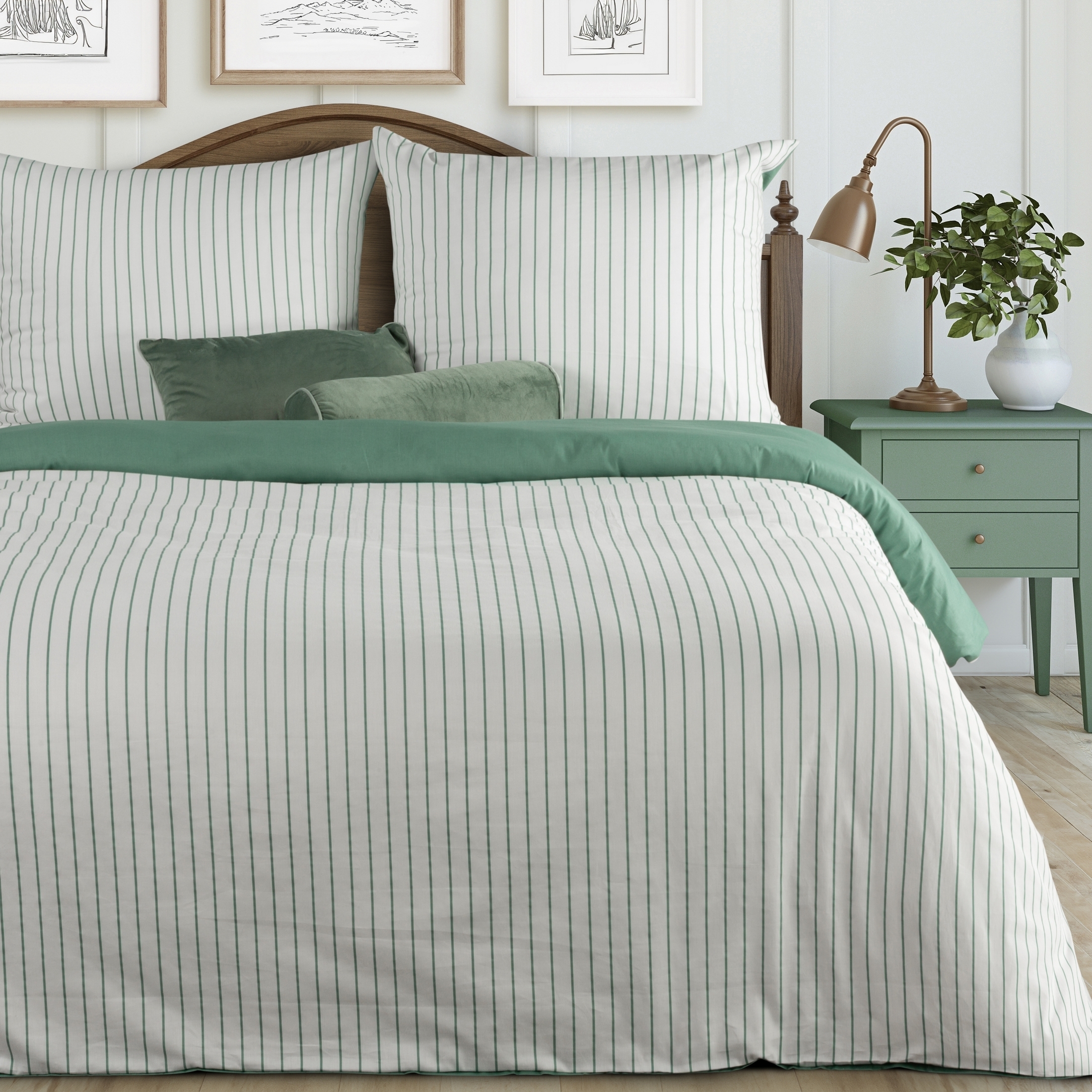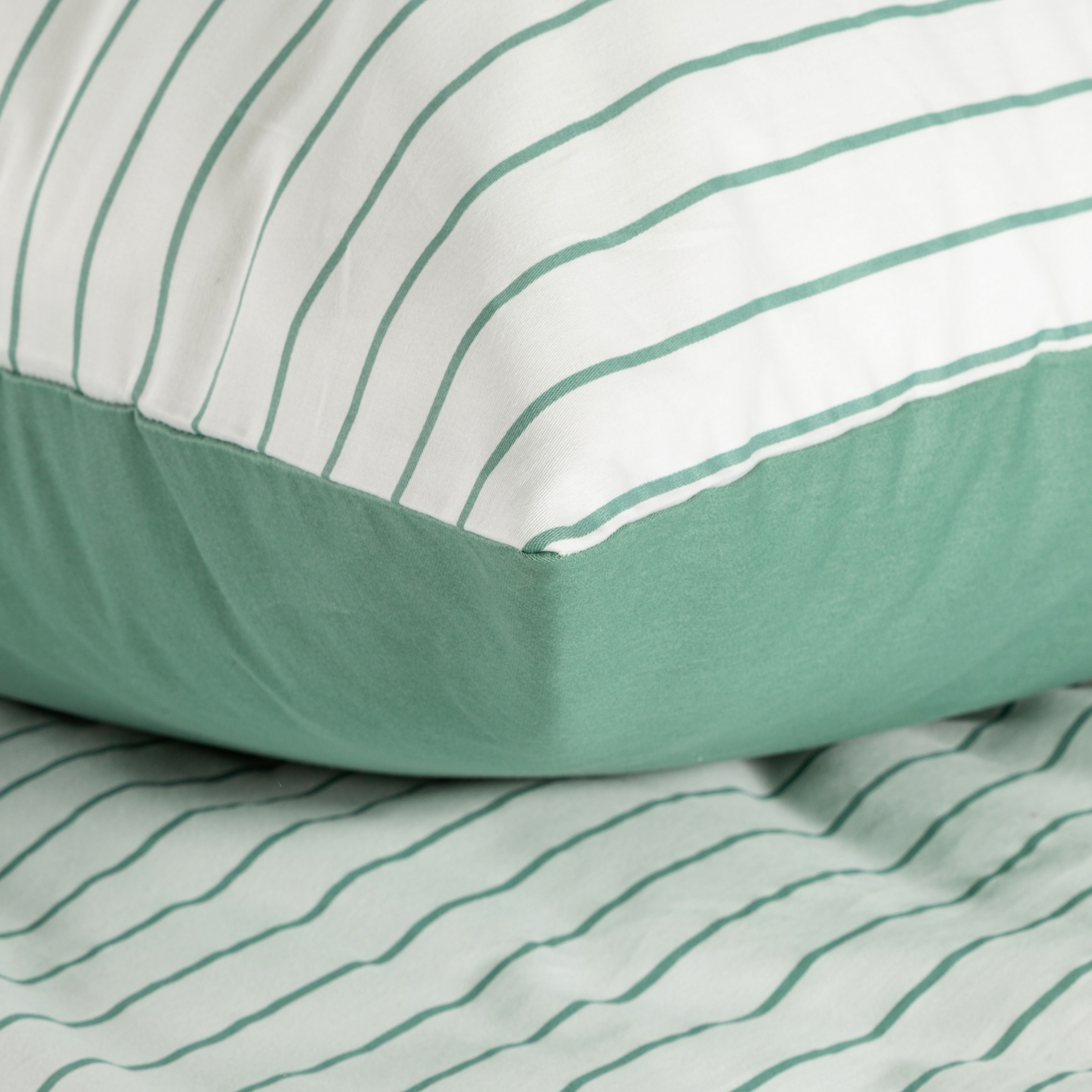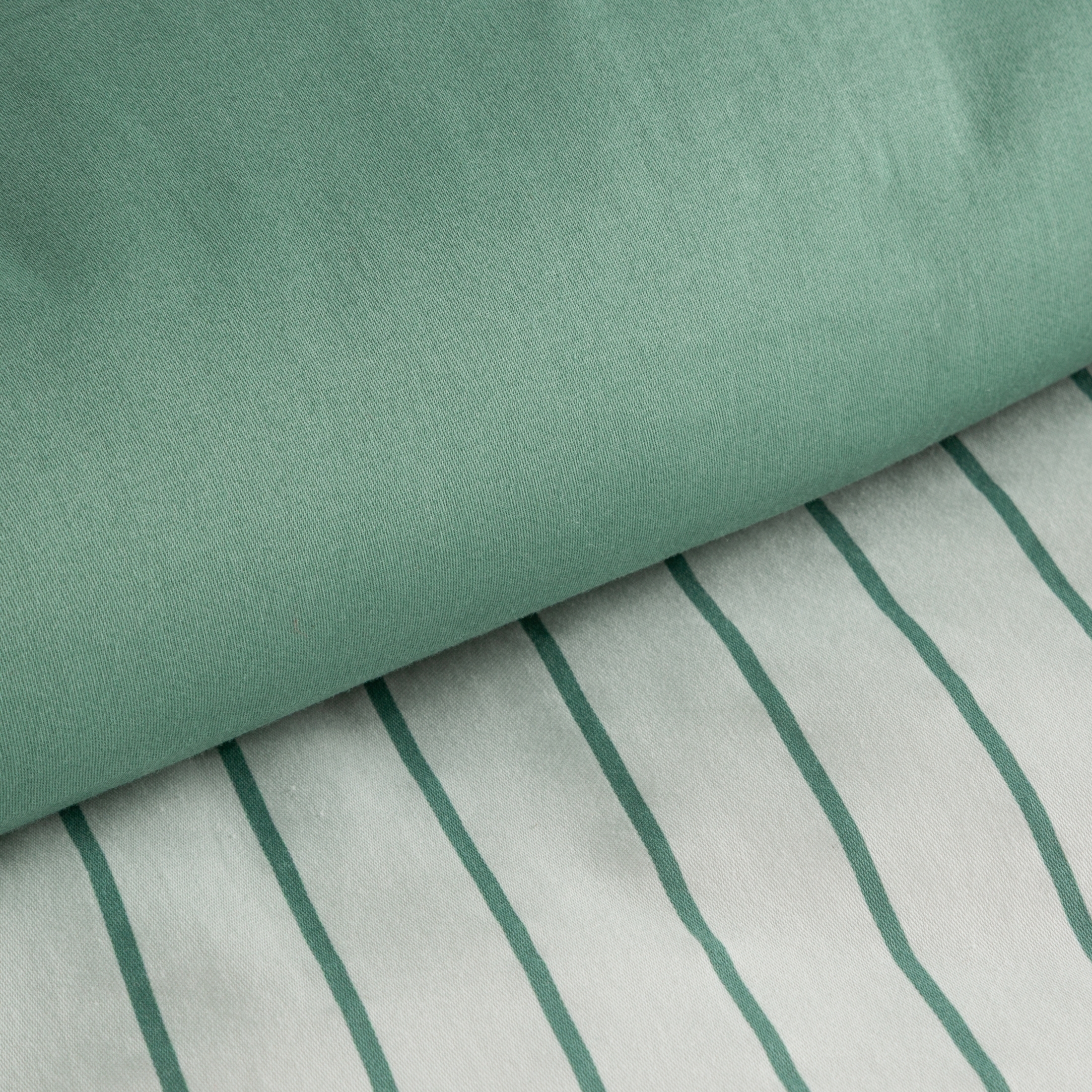 Komplet pościeli uszyty z wysokiej jakości satyny bawełnianej łączy komfort użytkowania z nowoczesnym designem. Przód zdobi delikatny nadruk w paseczki wykonany metodą digital print, a druga strona pościeli jest gładka i jednokolorowa, co daje możliwość różnorodnych aranżacji w sypialni. Pościel posiada certyfikat OEKO-TEX, gwarantujący bezpieczeństwo i brak szkodliwych substancji. Kolekcja obejmuje również pościel z motywem liści palmowych, dzięki czemu można zestawiać różne komplety w jednym łóżku, tworząc wyjątkową, nowoczesną aranżację sypialni.