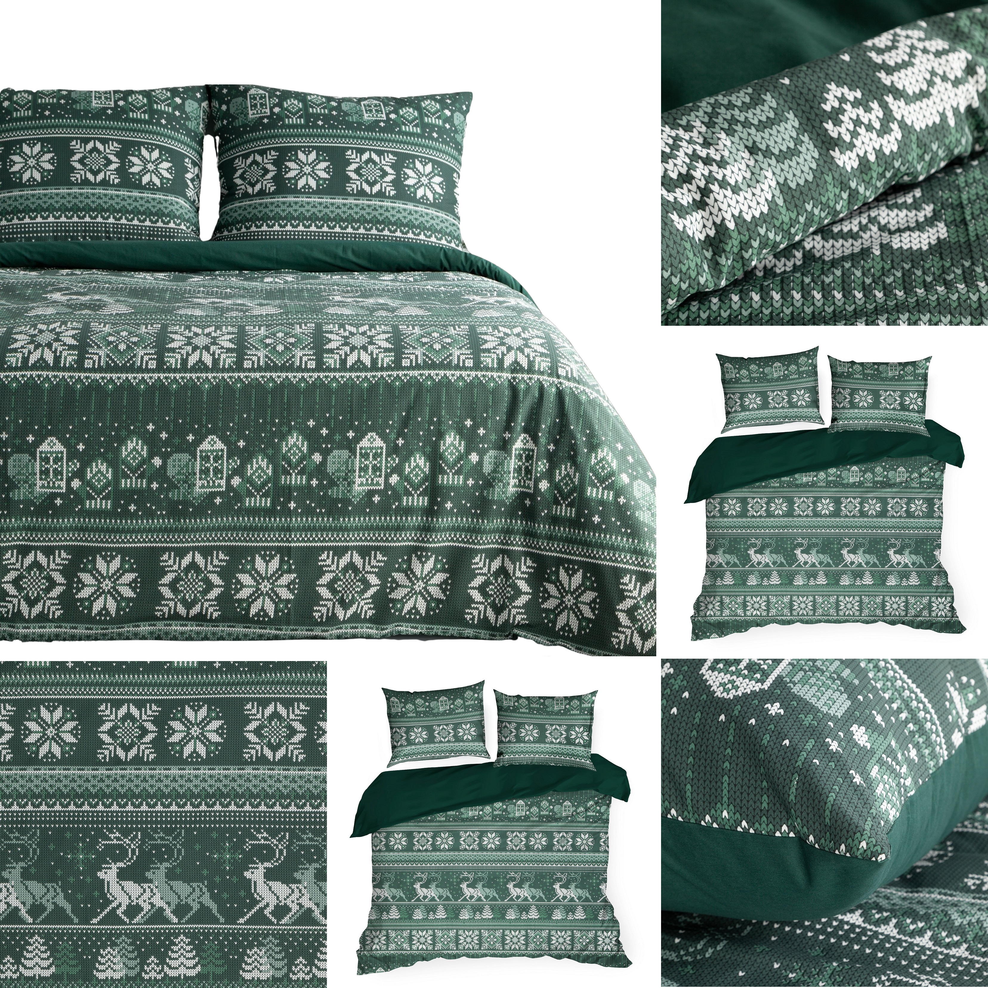 Wprowadź do swojej sypialni przytulny, świąteczny nastrój dzięki kompletowi pościeli wykonanej z wysokiej jakości bawełny ranforce. Po jednej stronie pościel zdobiona jest subtelnym nadrukiem, natomiast druga strona pozostaje gładka w eleganckim, ciemnozielonym odcieniu, co pozwala na łatwe dopasowanie wyglądu sypialni do nastroju i dekoracji wnętrza.